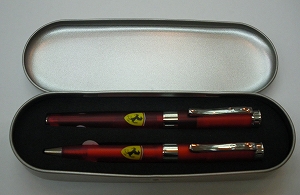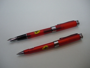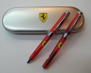 NEW! ■ Ferrari万年筆&ボールペンセット 品番:109 サイズ:180mm(最大幅)×60mm(縦)/ケース \5,600 (税込価格\5,880) ※万年筆のリフィルはモンブラン製 ポールペンのリフィルはパーカー製の物を お使い頂けます。 |